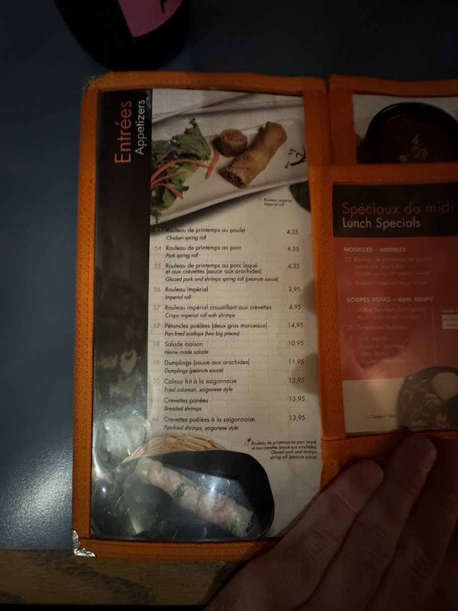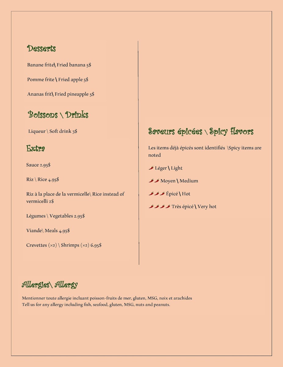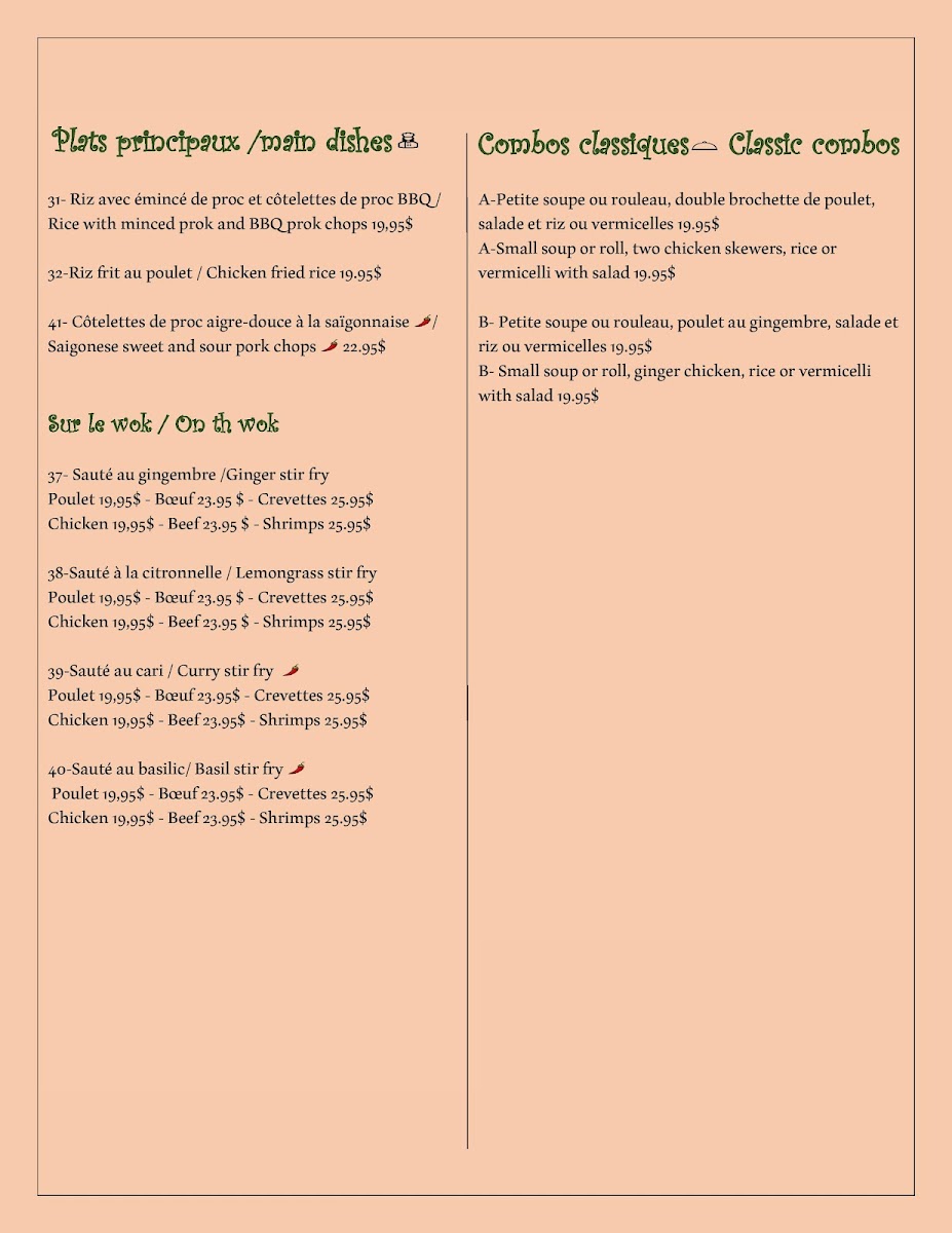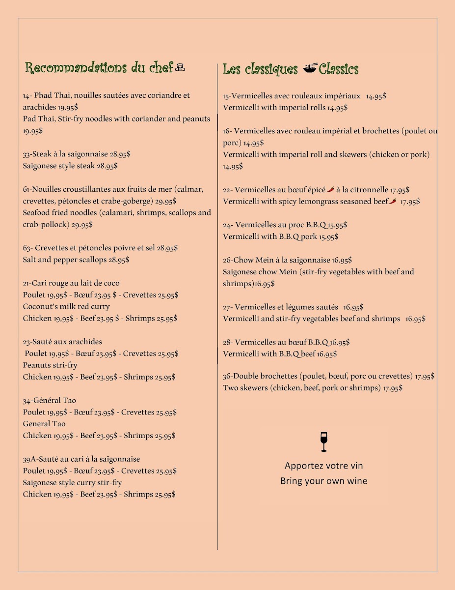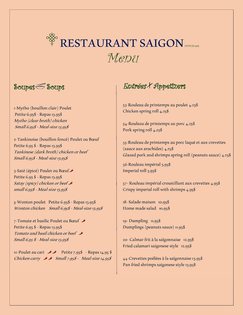 Welcome to Café Saigon, your local haven for authentic Vietnamese cuisine located in the heart of Montreal. As you browse through the enticing menu, you'll discover a delightful array of offerings that cater to every palate. From the fresh Rouleau de printemps featuring chicken and pork at just CA$4.25 to the rich and aromatic Cari rouge au lait de coco, there’s something to tantalize every taste bud.